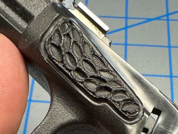 Custom cut, boardered, and stippled segments on the fore end of the frame, creating a rough surface for the operators off hand thumb to drive more friction force into the frame for more control while firing.